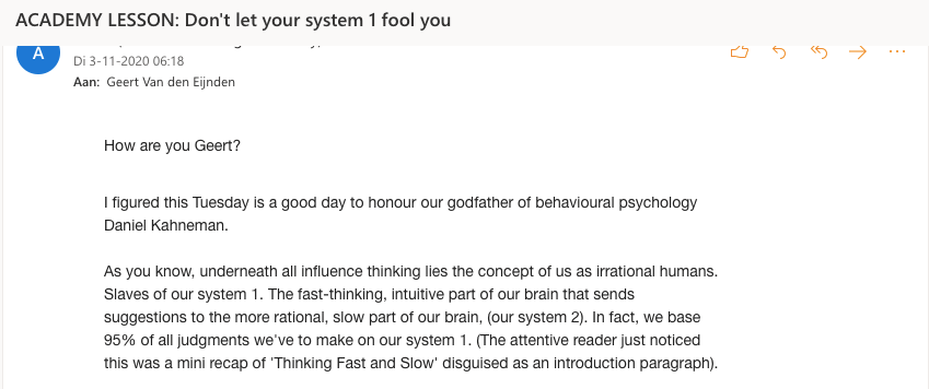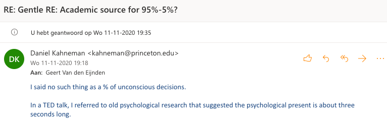 It had been 7 hours, 21 minutes and 31 days, but I got a reply from Nobel Prize winner Daniel Kahneman. An angry reply: “I said no such thing as a % of unconscious decisions”.